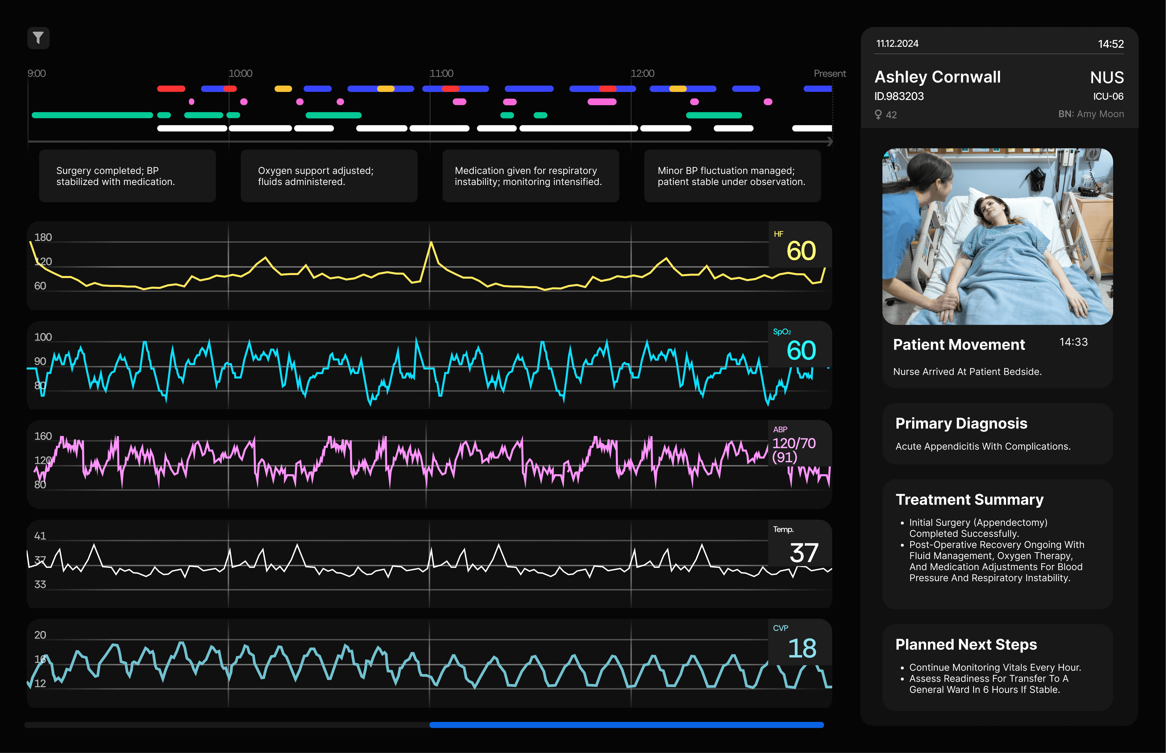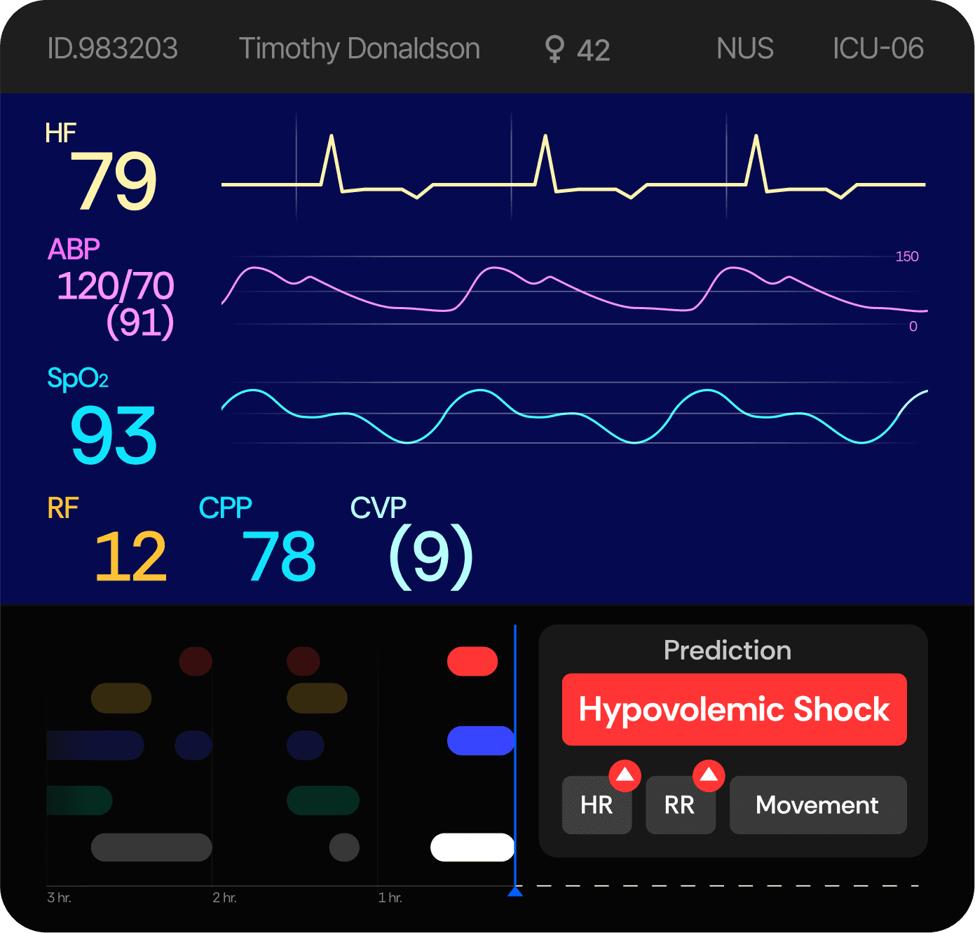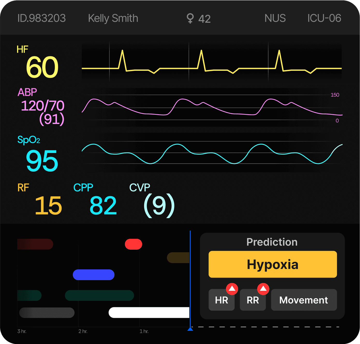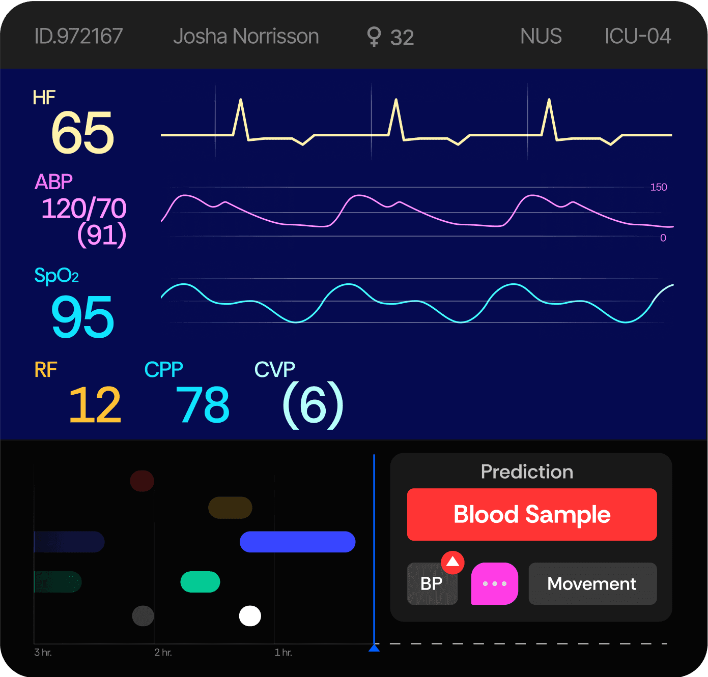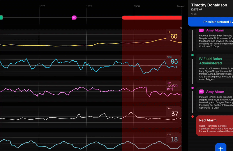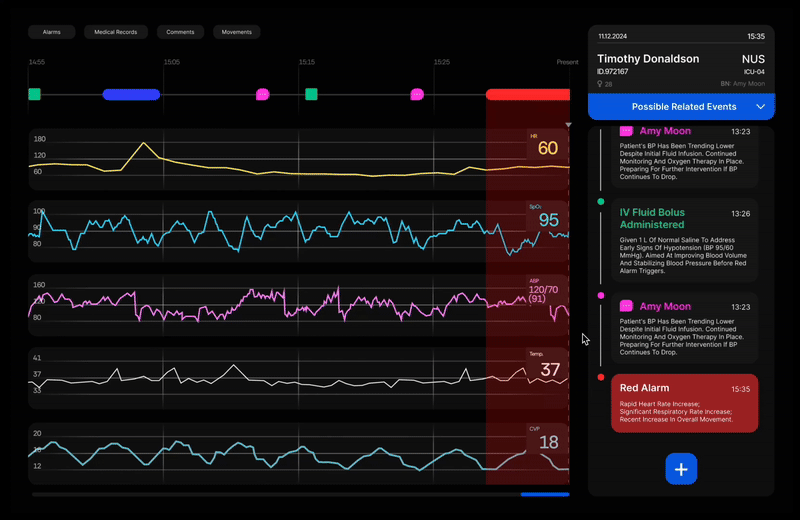 A compact timeline view consolidates alarms, medical events, and patient activity. In the lower-right corner, an AI-driven prediction panel uses historical data to forecast potential conditions — for example, hypoxia — enabling early intervention. Alarms are also contextualized: when triggered, the system provides AI-generated insights into possible causes (eg.Blood Sample caused the red alarm).