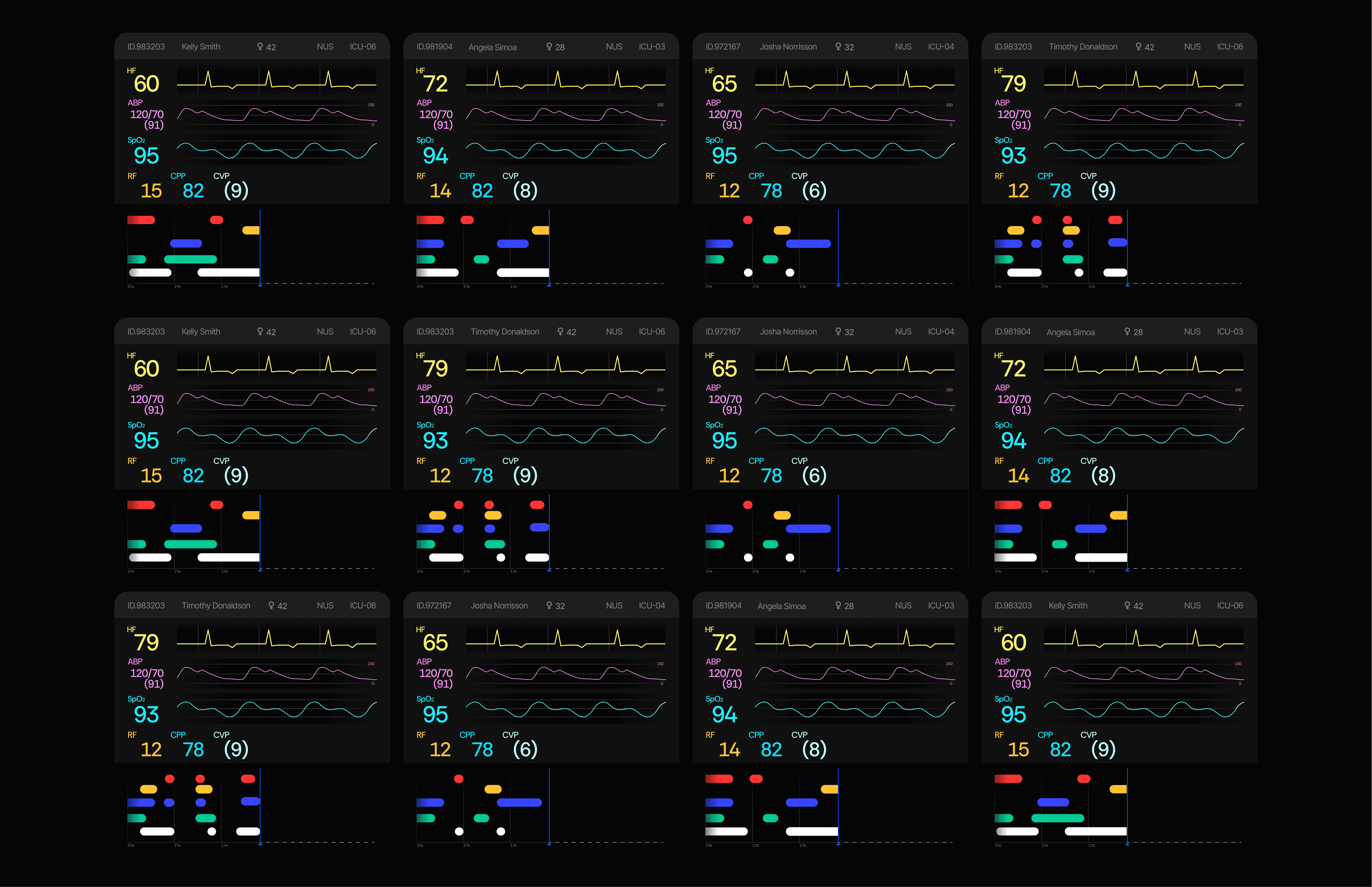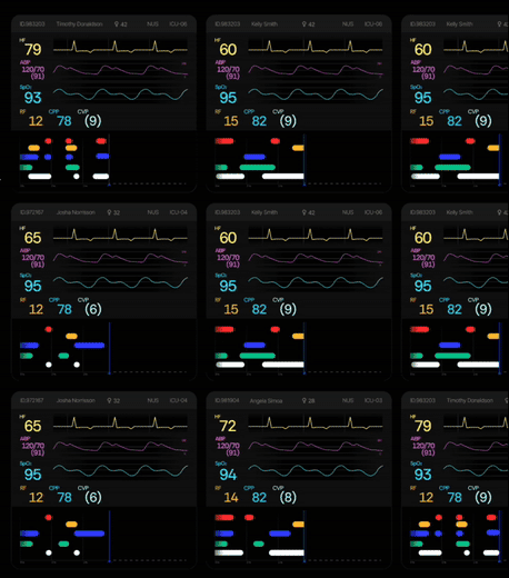 The tele-nurse interface consists of two screens: the left provides an overall monitoring view, while the right offers a detailed view of a single patient. The overall view shows a condensed 4-hour timeline, whereas the detailed screen breaks down the patient’s history more comprehensively, enabling nurses to quickly spot trends and make informed decisions.